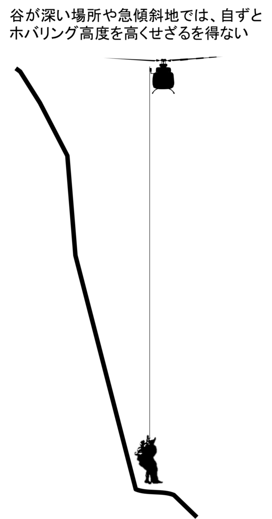 さらに、降下員の降下する位置が背の高い立木に囲まれているような場所、急傾斜地や、深い谷などはホバリング高度が自ずと高くなるためその分ケーブルを長く繰り出さねばならず、ヘリから「的(まと)」(降下位置)が遠くなるので困難さも増して作業時間がより長くなります。