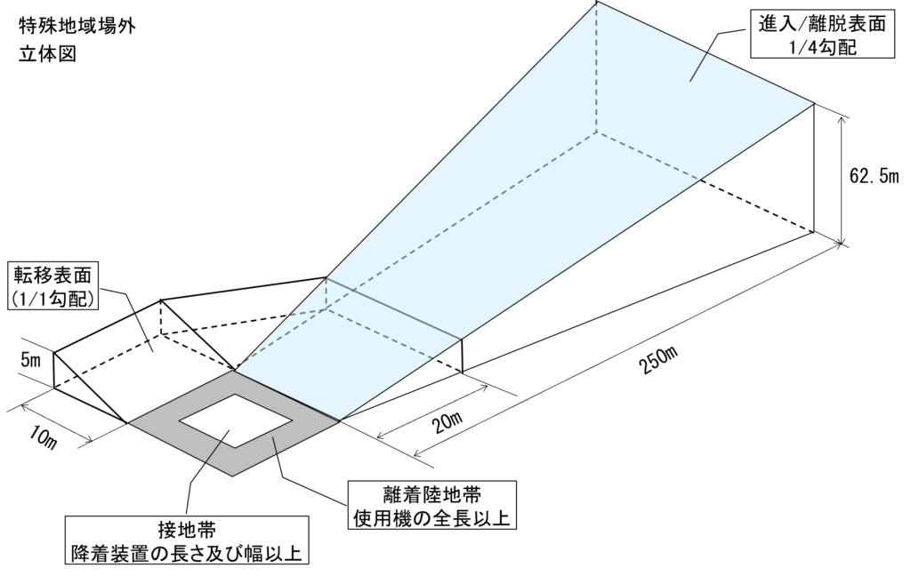 「仮想離着陸帯」といって、周辺障害物の状況によって必要に応じ最高15mまでの高さ=「空中」に離着陸帯(下図では破線で表示)を設定できるため、進入離脱表面が高いところに設定でき、そのおかげで周辺の障害物にとても「強い」のが特長です。