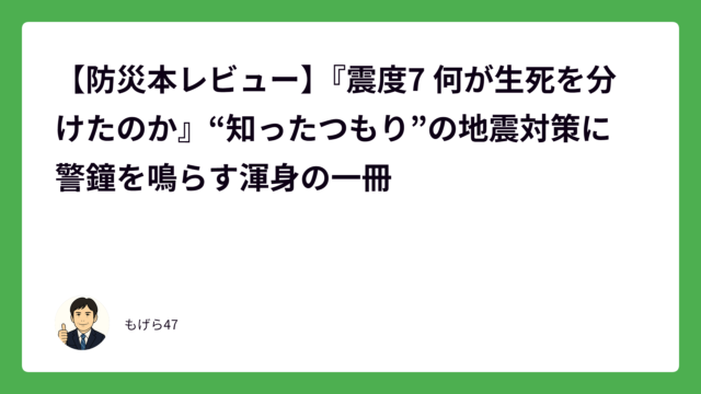 防災本レビュー【防災本レビュー】『震度7 何が生死を分けたのか』“知ったつもり”の地震対策に警鐘を鳴らす渾身の一冊 2025年9月30日 もげら47 https://mogera47.com/wp-content/uploads/2025/07/ブログタイトルロゴ_200.png 防災ハック