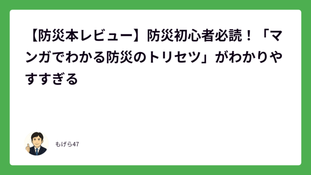 防災本レビュー【防災本レビュー】防災初心者必読!「マンガでわかる防災のトリセツ」がわかりやすすぎる 2025年9月30日 もげら47 https://mogera47.com/wp-content/uploads/2025/07/ブログタイトルロゴ_200.png 防災ハック