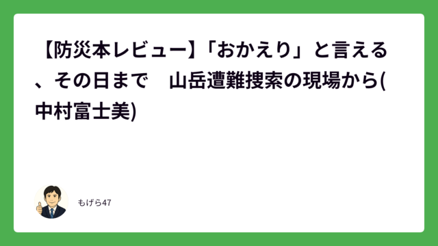防災本レビュー【防災本レビュー】「おかえり」と言える、その日まで 山岳遭難捜索の現場から(中村富士美) 2025年8月10日 もげら47 https://mogera47.com/wp-content/uploads/2025/07/ブログタイトルロゴ_200.png 防災ハック